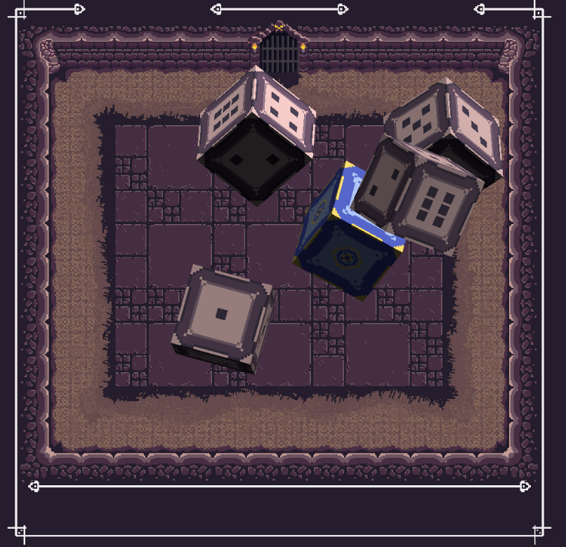 The dice were effectively cubes that were given a small force in a random direction plus gravity enabled to have them fall to the arena below. I added logic to re-activate any dice that were cocked or landed on another dice until all dice were flat at rest. From there, the dice would determine spawn locations for the 2D player sprite, enemy sprites and any treasure sprites that were rolled.